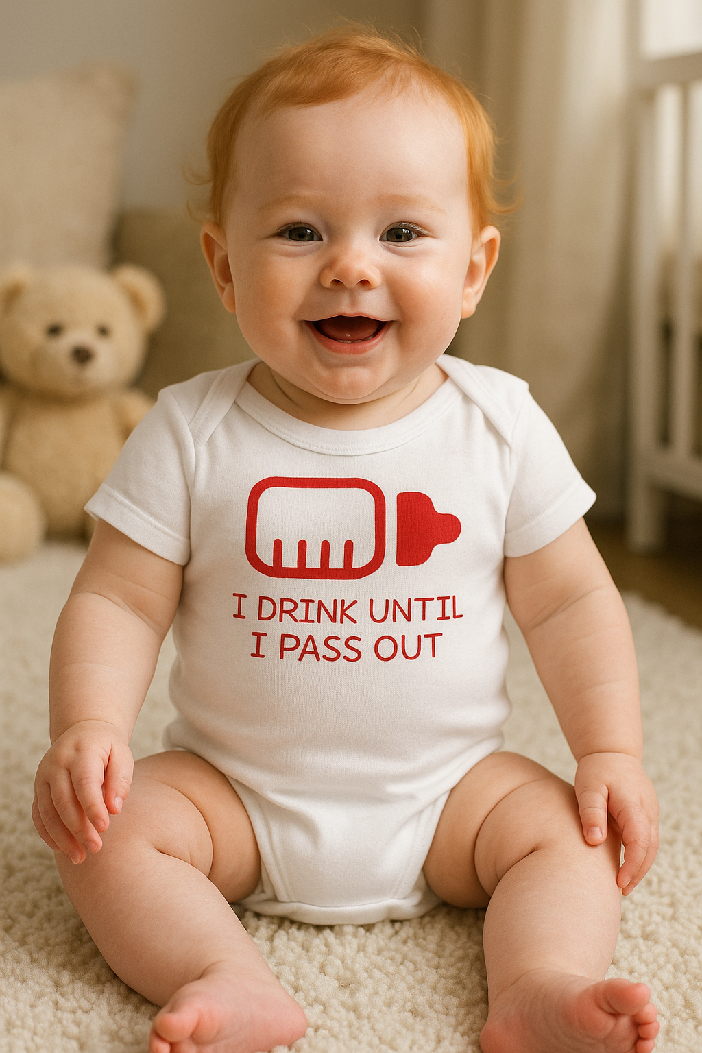 Wenn die Flasche leer ist, ist auch die Batterie! 🍼 Weißer Baby-Body mit rotem Print und dem Slogan I DRINK UNTIL I PASS OUT – sorgt bei jedem Windelwechsel für Lacher. Perfekt für Eltern mit Humor und kleine Schlafmützen.