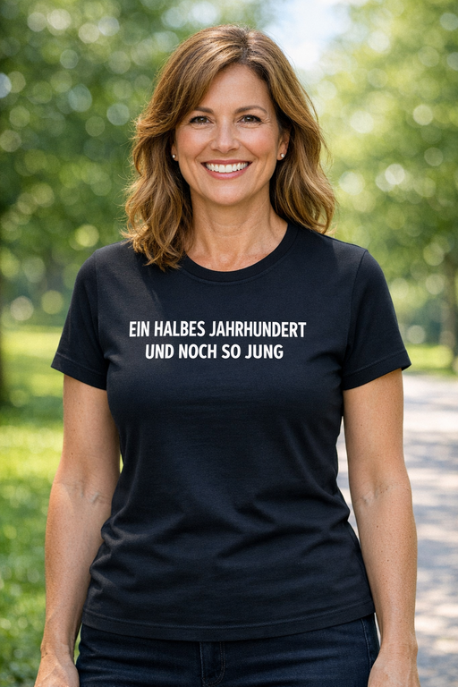 Ein halbes Jahrhundert – und immer noch so jung: Dieses schwarze Damen-T-Shirt bringt die Message auf den Punkt.