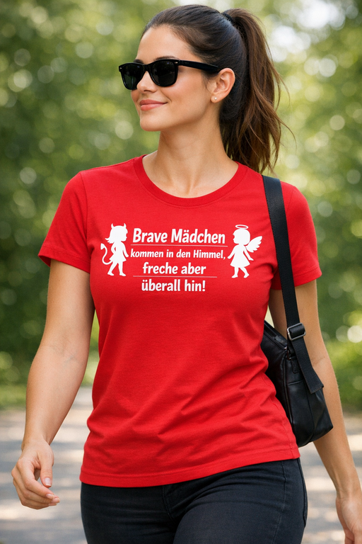 Dieses rote Damen-T-Shirt mit weißem Print und den Silhouetten von Teufelchen und Engelchen bringt die Botschaft auf den Punkt: „Brave Mädchen kommen in den Himmel, freche aber überall hin!“ Für Frauen, die mühelos zwischen Heiligenschein und Hörnchen wechseln – vom Büro bis zur Party, ohne Ausreden.