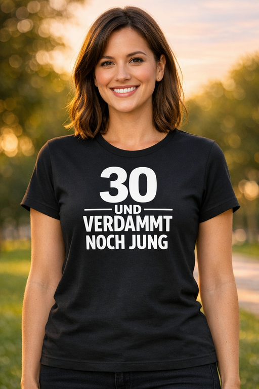30 und immer noch die Queen: „30 UND VERDAMMT NOCH JUNG“ – auf schwarzem, figurbetontem T-Shirt. Punkt.