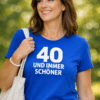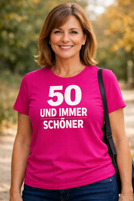 Wenn die große 50 ansteht, darf’s ruhig eine Farbe sein, die strahlt – und ein Spruch, der sitzt. Das magentafarbene T-Shirt mit weißem Print zieht Blicke an und sorgt schon beim Reinkommen für gute Laune. Hinweis: erhöhte Kompliment- und Selfie-Gefahr. 😉