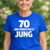 Dieses königsblaue T-Shirt mit kurzen Ärmeln und dem klaren, weißen Statement „80 UND IMMER NOCH JUNG“ bringt die Botschaft auf den Punkt: Style, Lebensfreude und ein bisschen frecher Humor werden nicht älter. Auf der Feier sorgt es für Lacher, auf Fotos ist es ein echter Hingucker – und im Alltag erinnert es jedes Mal daran, wie COOL die Jubilarin ist.