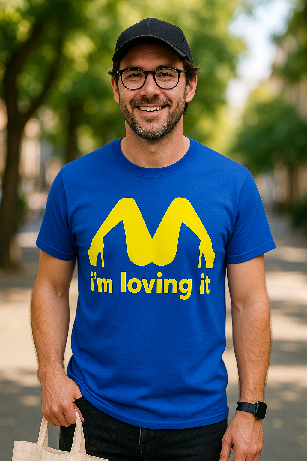 🍟 Wenn Beine ein M formen, ruft dein Outfit: i’m loving it! Dieses blaue Kurzarm‑T-Shirt mit gelbem, grafischem M aus Frauenbeinen in High Heels ist das Rezept für den Sofort‑Grinser. Du ziehst es an – und die Leute wissen nicht, ob sie klatschen oder gleich noch eine Extraportion Humor bestellen sollen.
