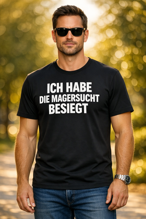 😎 Statement auf der Brust, Humor im Gepäck: T-Shirt mit „ICH HABE DIE MAGERSUCHT BESIEGT“.
