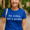 Das blaue Kurzarm‑T‑Shirt mit weißem Druck entwaffnet Kritiker:innen und bringt das Team zum Lachen, noch bevor jemand „Hallo“ sagt. Ideal, wenn du charmieren willst, ohne dich zu verstellen.