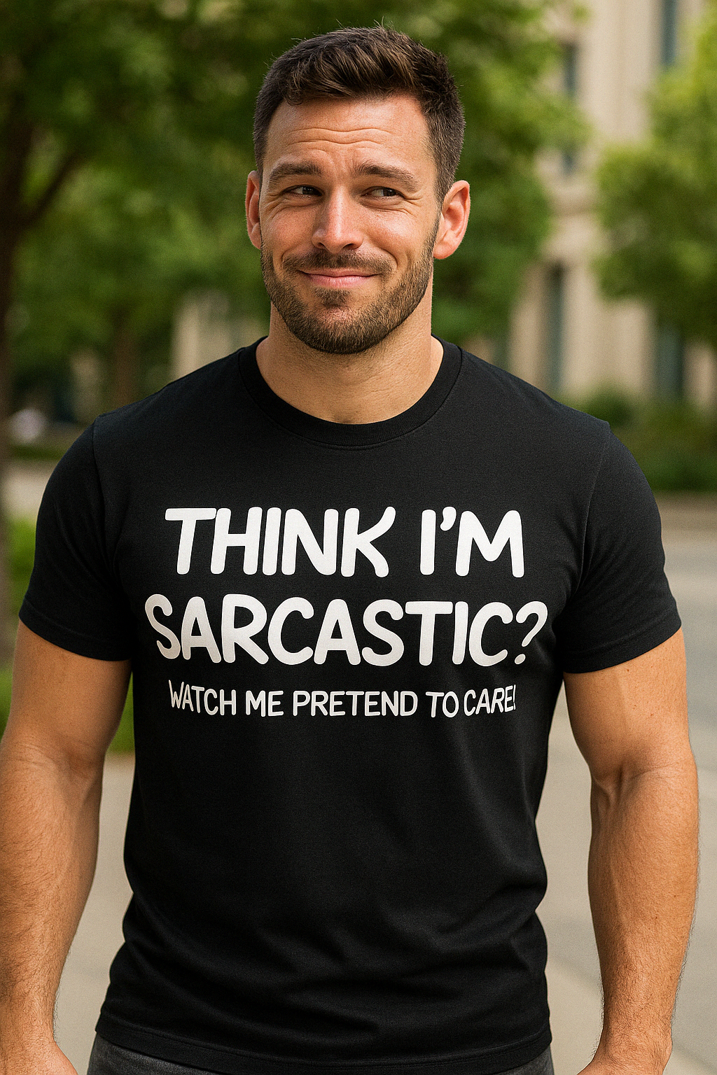 Wenn dich jemand fragt, ob du sarkastisch bist, lass dein Shirt antworten. 😏 Schwarzes T-Shirt mit dem Print „THINK I’M SARCASTIC? WATCH ME PRETEND TO CARE!“ – perfekt für bissige Zyniker im Büro, in der Uni oder auf der Couch. 😉