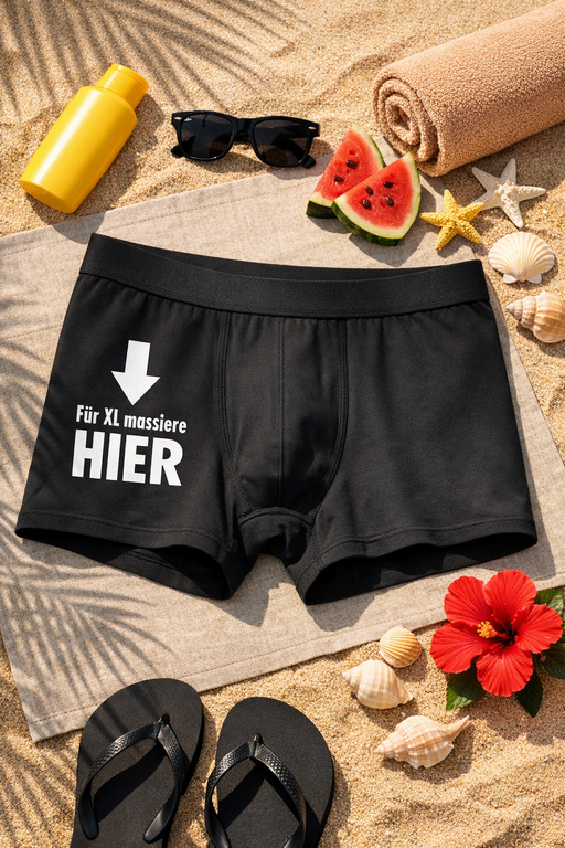 Diese schwarzen Herren-Boxershorts mit frechem Pfeil am linken Oberschenkel lenken die Aufmerksamkeit ganz dezent dorthin, wo „Massage“ am meisten geschätzt wird. Ideal für Momente, in denen Charme, Humor und ein Hauch Augenzwinkern gefragt sind – Ergebnis: Grinsen, rote Wangen und der Fokus sitzt.