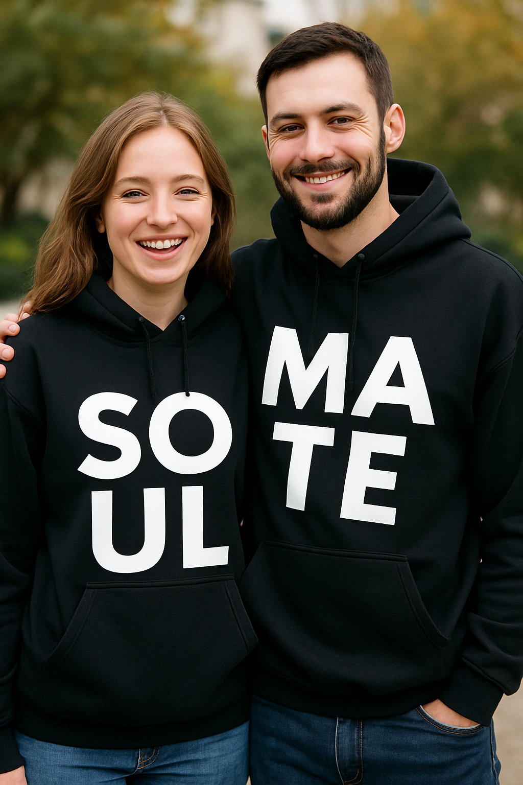 💫 Wenn ihr nebeneinander steht, wird aus „SO UL“ und „MA TE“ ein lautes SOUL MATE – und euer Foto bekommt gefühlt 100 % mehr Likes. Einzeln geheimnisvoll, zusammen unschlagbar: zwei schwarze Hoodies mit großen weißen Buchstaben, die alles sagen – ganz ohne lange Reden.