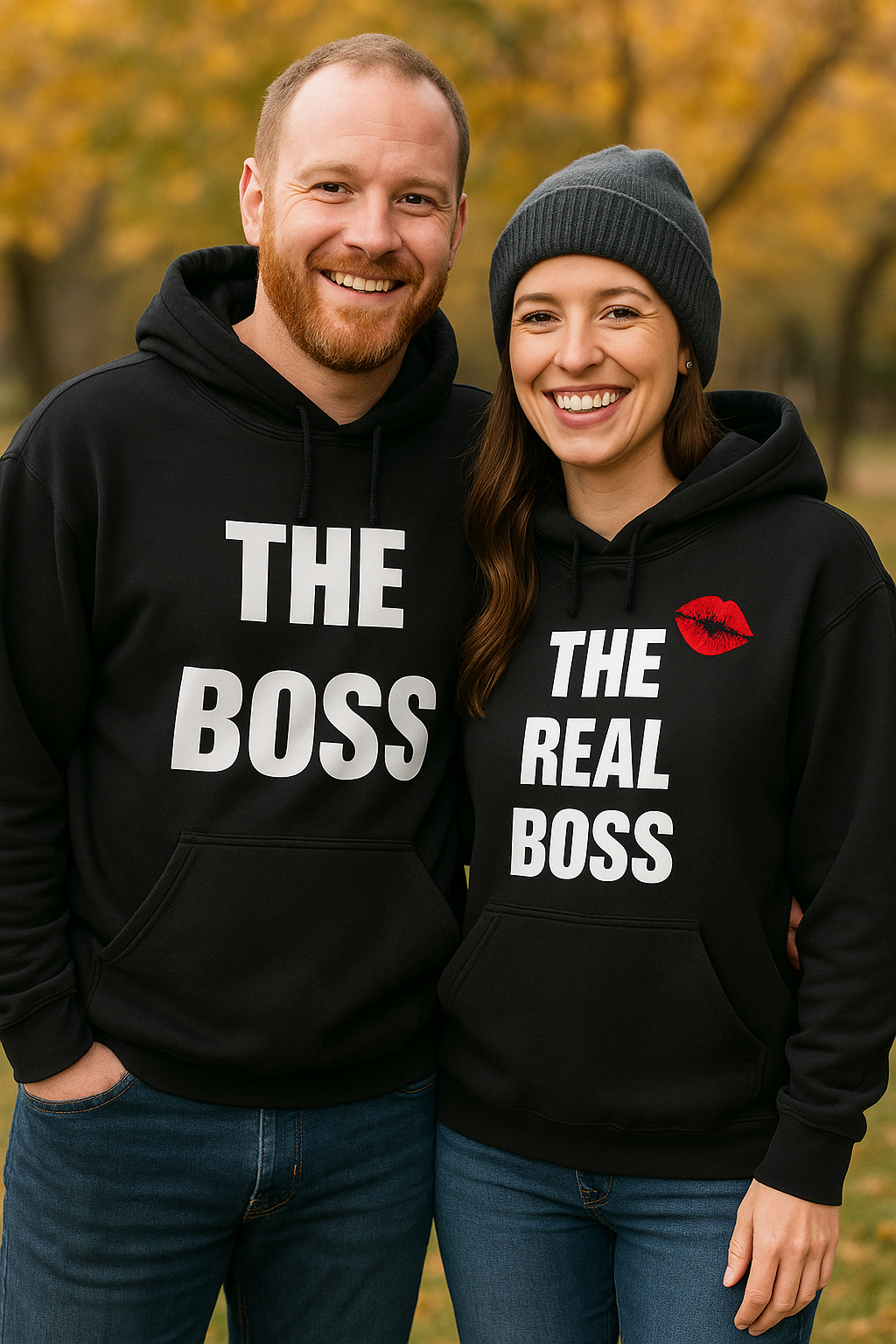 😎 THE BOSS oder THE REAL BOSS? Ein Hoodie-Set, bei dem der Kuss die Wahrheit verrät! Ein Hoodie erklärt THE BOSS, der andere (natürlich) THE REAL BOSS — mit dem roten Kussmund über dem Print, der sagt: „Entschieden!“ Ideal für Paare, die das Chefsein mit einem Lächeln klären und jedes Foto in eine Mini-Komödie verwandeln. Zwei schwarze Hoodies, ein großer Inside-Joke.