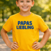 Blaues Kinder T-Shirt mit gelbem Statement „Papas Steuererleichterung“ – der kleine Sparfuchs mit Humor. Perfekt für Babys und Kleinkinder und für Papas, die bei Steuern (und Windeln) mitrechnen.