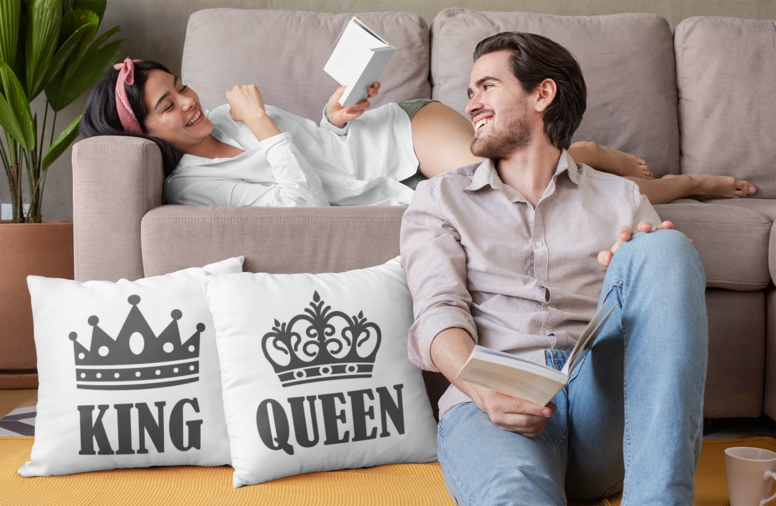 👑 Kröne dein Sofa mit dem Duo der KING QUEEN Kissen – wo Gemütlichkeit auf königlichen Schabernack trifft! Jede Kissenhülle trägt ihre Krone: König für mutige Entscheidungen (wie die extra Pizza), Königin für erlesenen Geschmack (und das letzte Wort). Zusammen sorgen sie für Lacher, Selfies und Frieden im Thronsaal des Wohnzimmers. Perfekt auch, um eindeutig zu markieren, auf welcher Bettseite wer regiert.