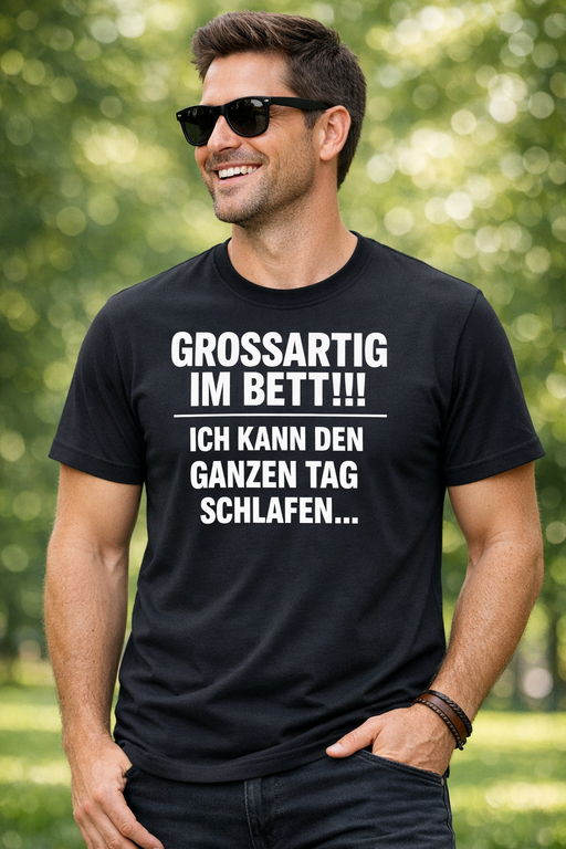 Lustiges T-Shirt „GROSSARTIG IM BETT!!! Ich kann den ganzen Tag schlafen…“