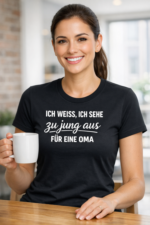 Lustiges Damen-T-Shirt „ICH WEISS, ICH SEHE zu jung aus FÜR EINE OMA“ (schwarz)