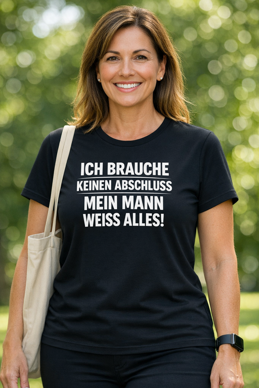Lustiges Damen T-Shirt: Ich brauche keinen Abschluss – mein Mann weiß alles!